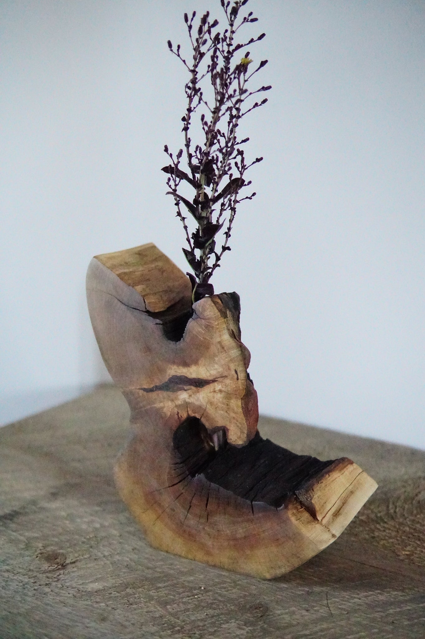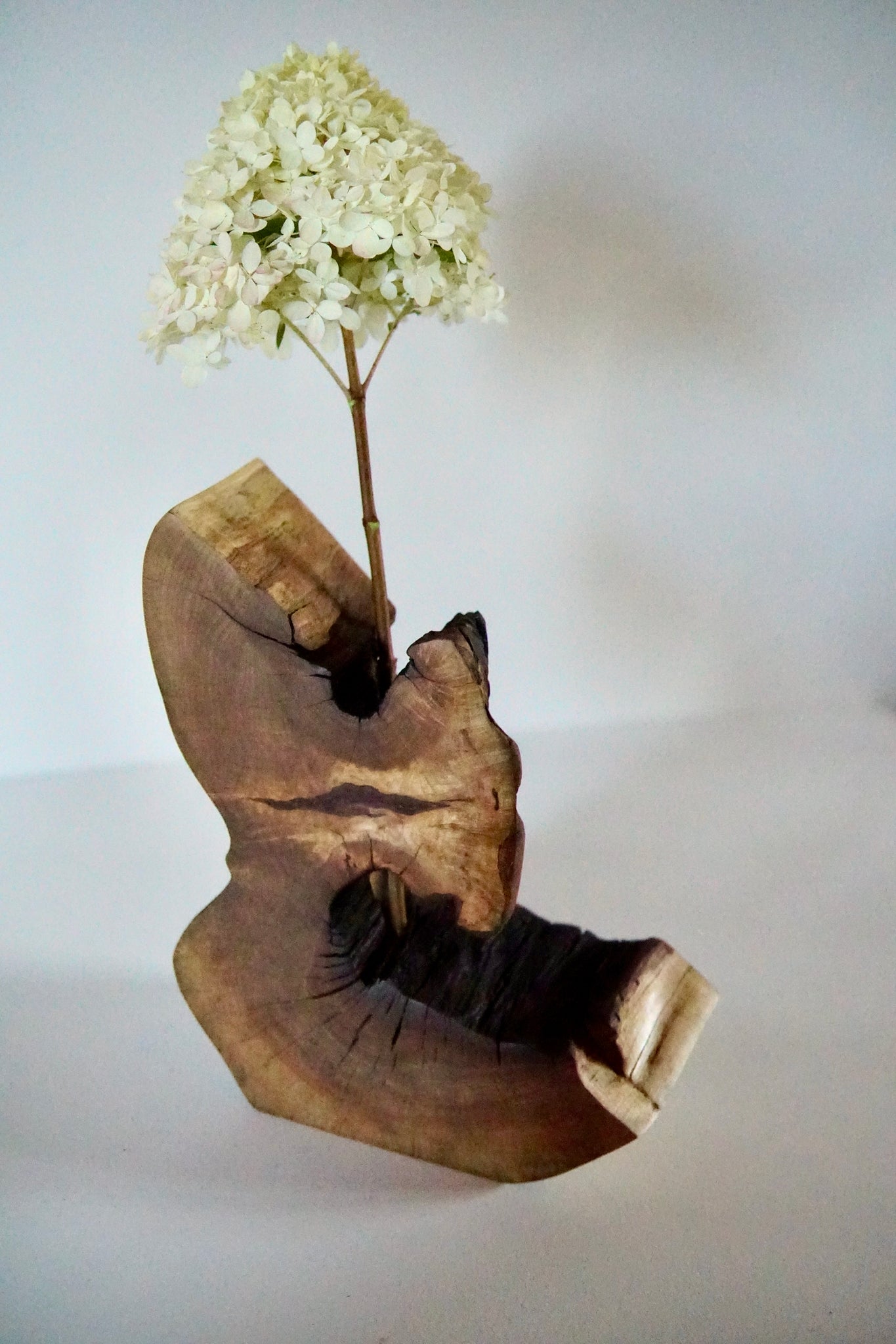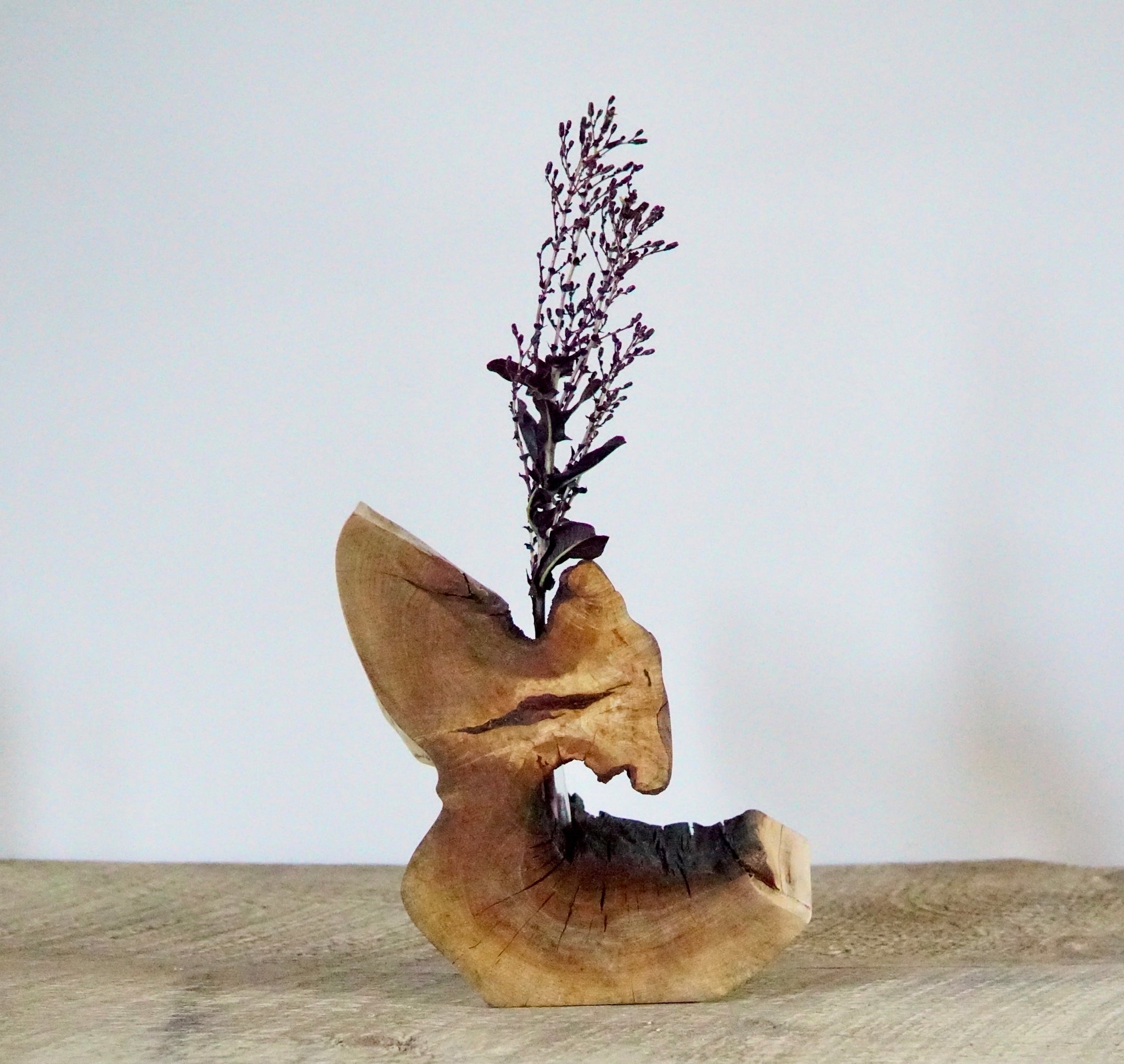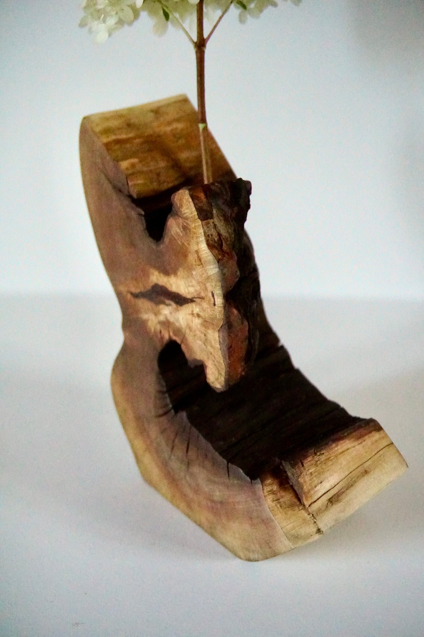 A glass vial nests within, allowing for a single stem or a simple arrangement. The contrast between wood and glass, solid and delicate, underscores the piece’s quiet balance. Each curve reveals the story of the tree’s growth—complex, imperfect, and beautifully resolved.