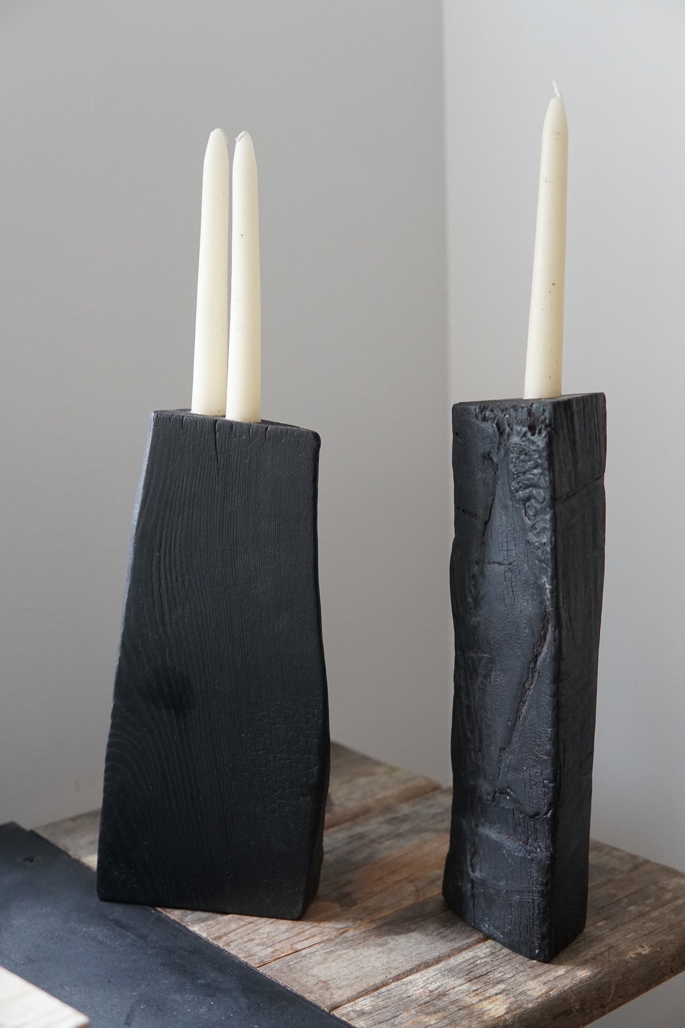 A pair of contrasts held in balance. Each candle holder is shaped from Ash wood and blackened by fire, then sealed to a quiet luster. One side remains raw and untamed, another is planed smooth, the third is rough carved by hand—three surfaces, three textures, three ways of catching the light.