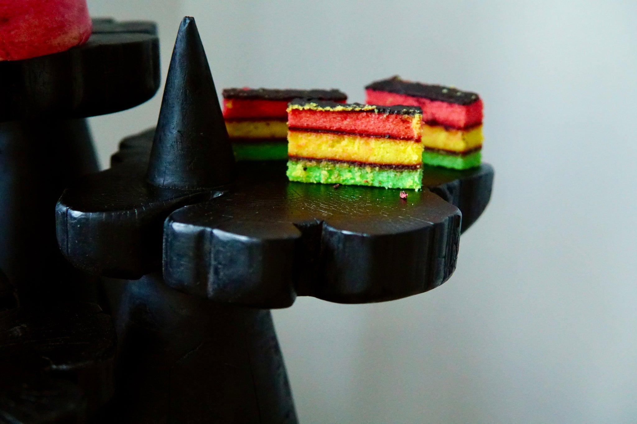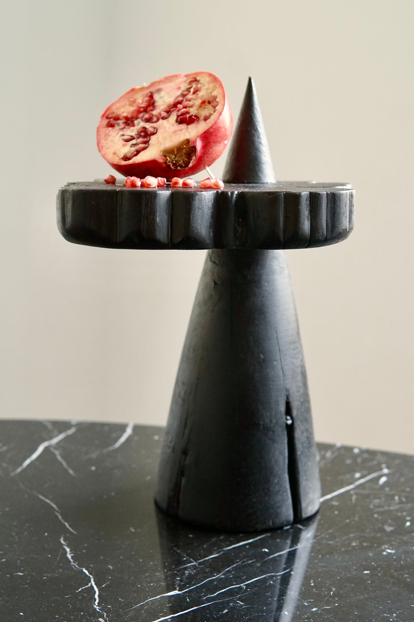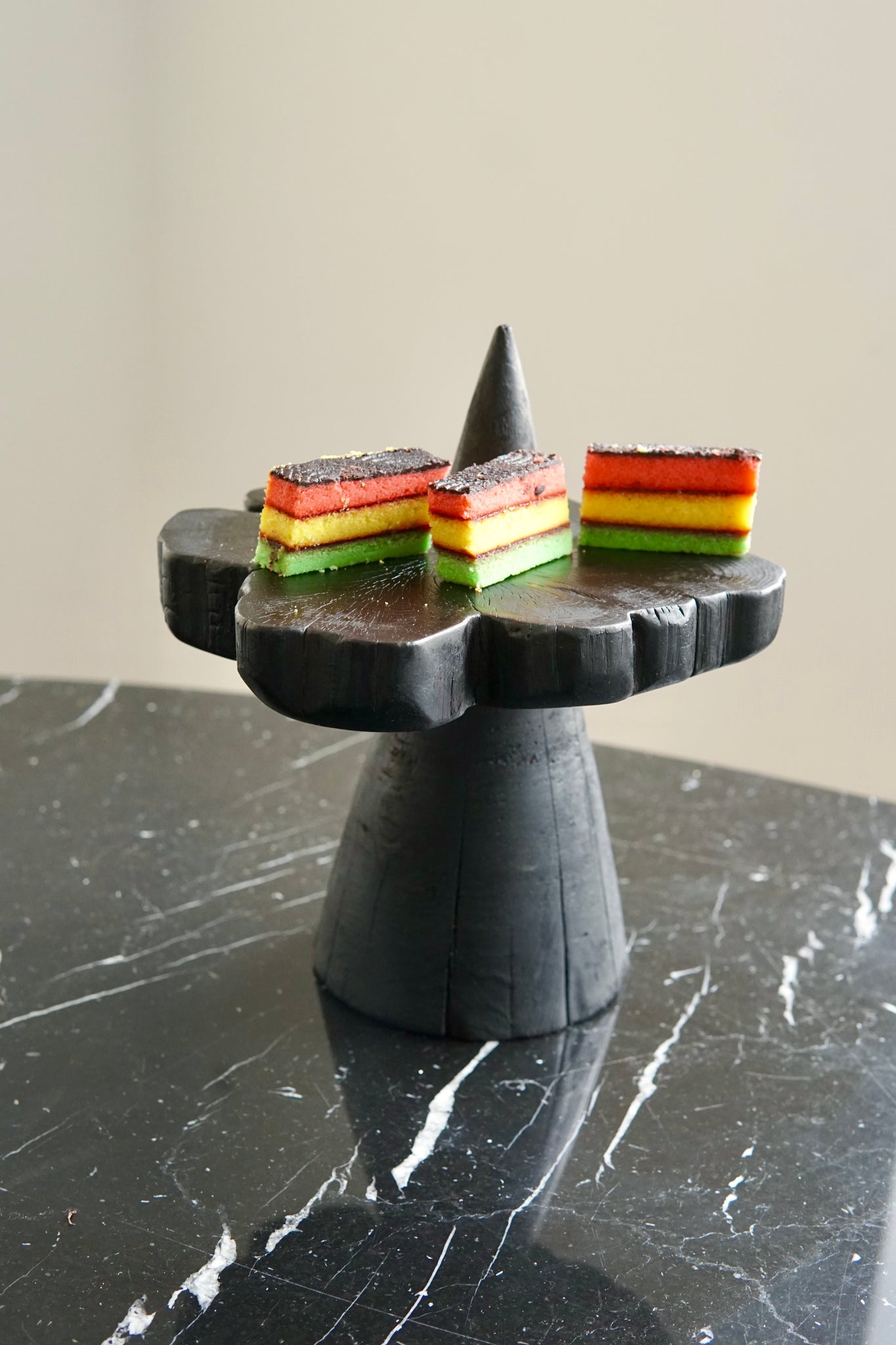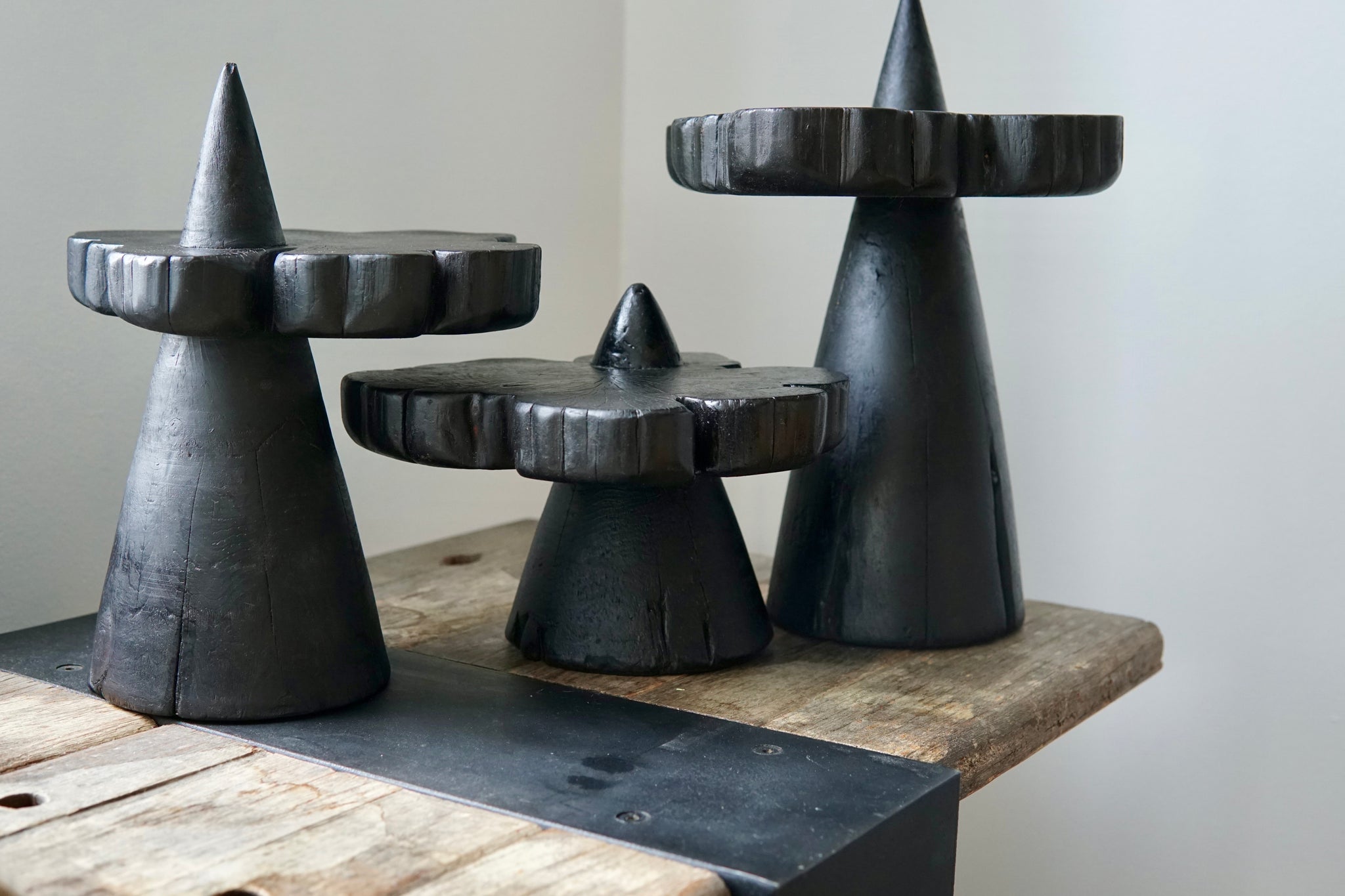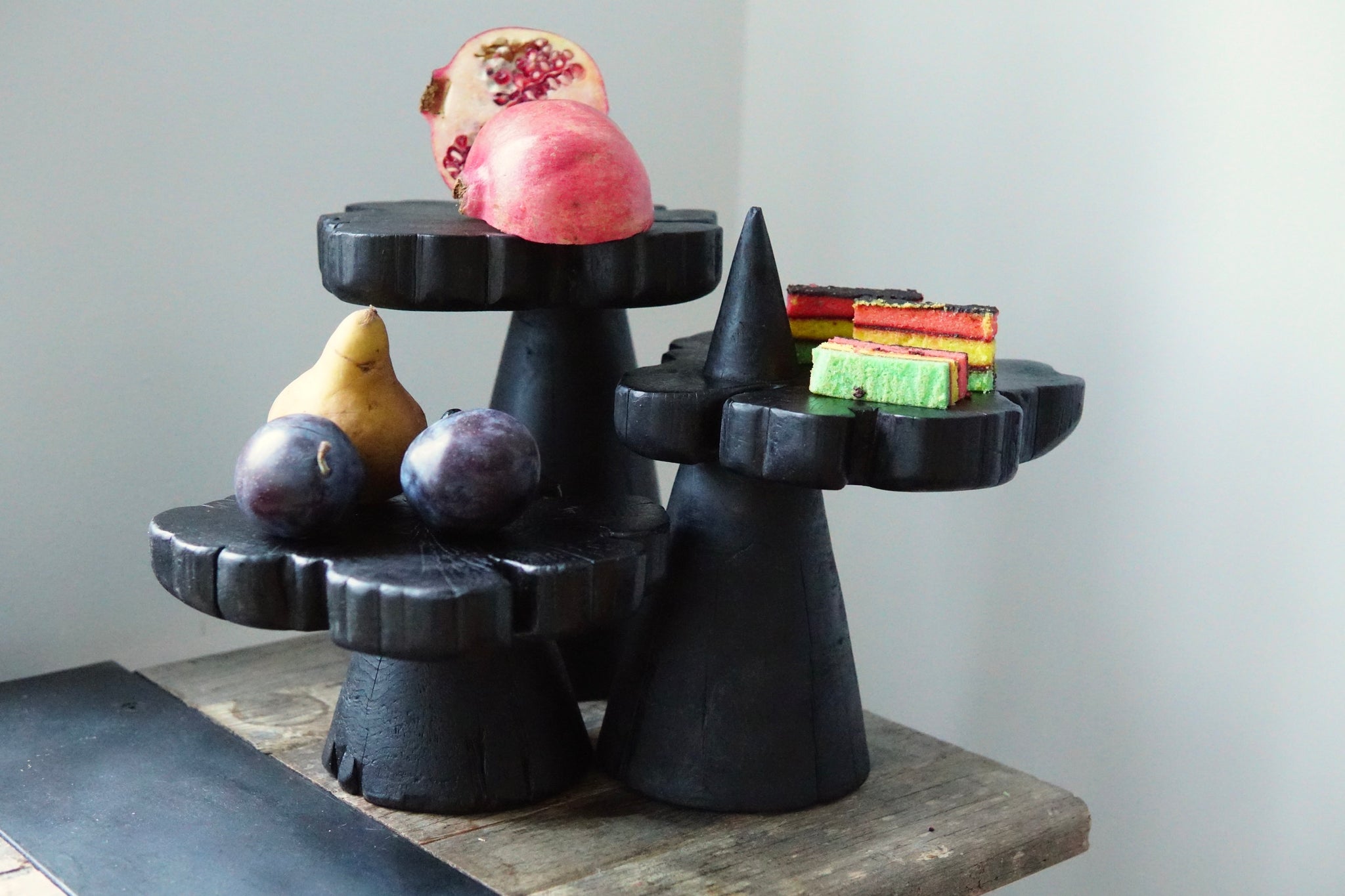 A trio of serving pedestals that bring both function and presence to the table. Each pedestal is shaped as a cone, topped with a cross section of cedar that reveals warm rings of growth. The three heights create a natural rhythm, reminiscent of mountain peaks rising through clouds.